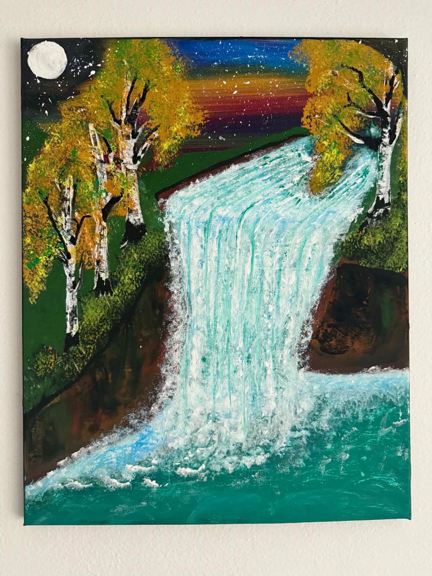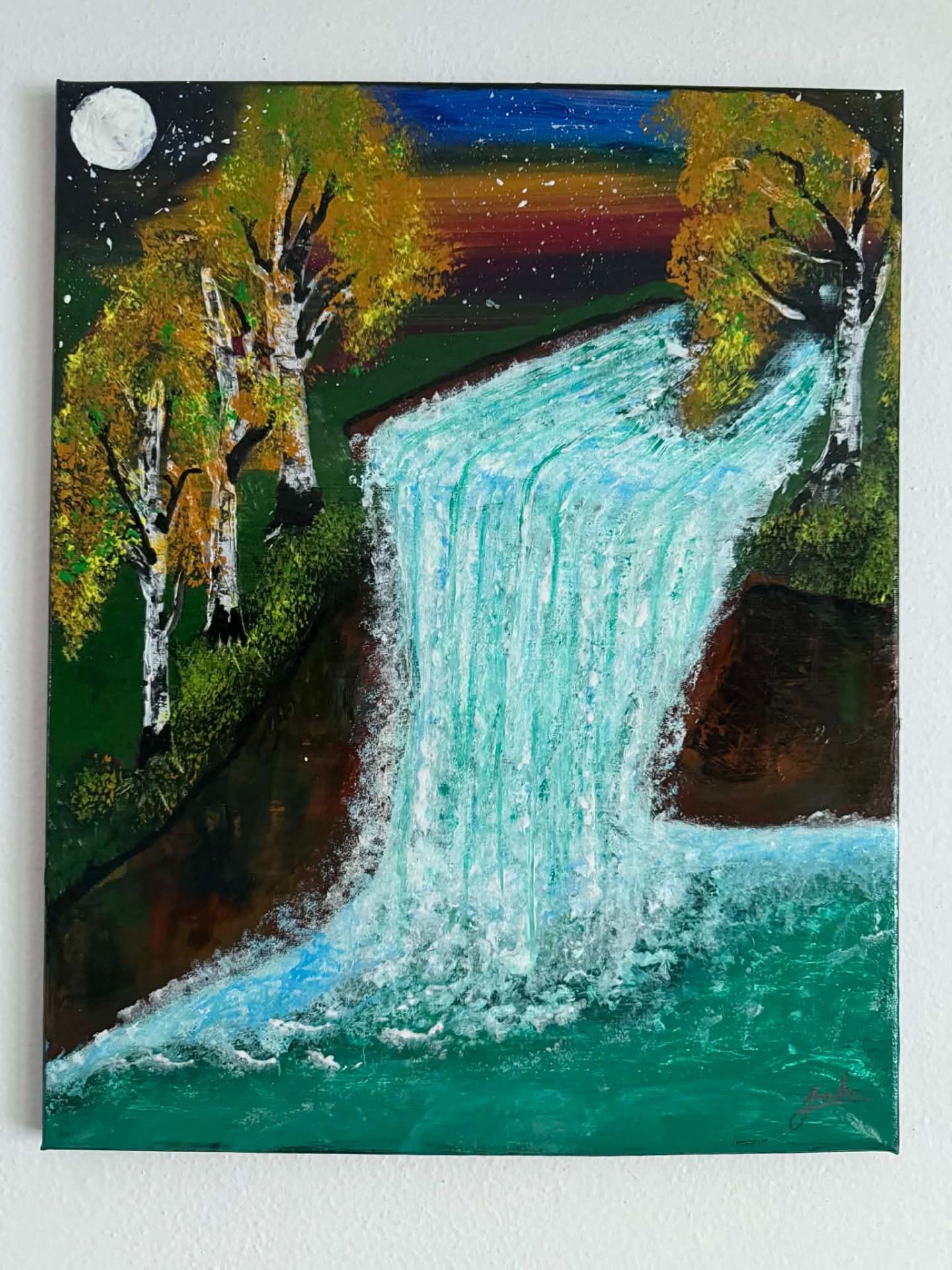 Ručne maľovaný obraz "Hudba padajúcej vody" zachytáva silu vodopádu osvetleného mesačným svetlom.