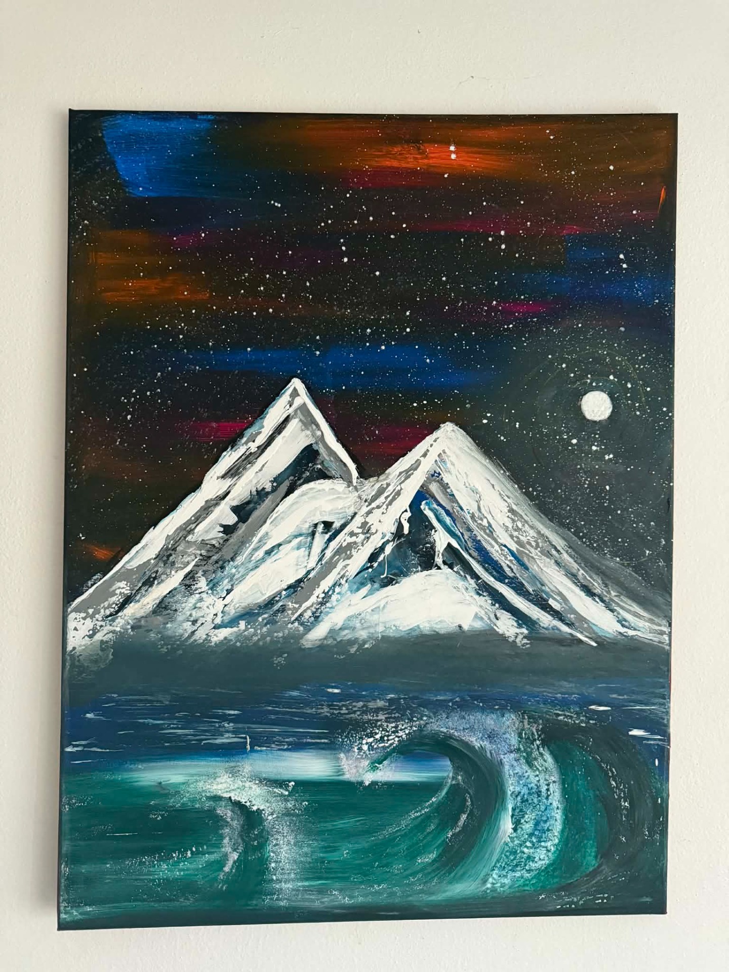 Dynamická vlna v popredí kontrastuje s pokojnou nočnou oblohou plnou hviezd, pričom studené tóny bielej a modrej vytvárajú dramatickú atmosféru zimnej noci.