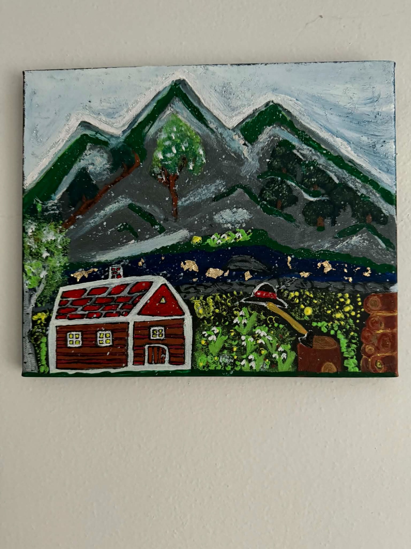 Ručne maľovaný obraz "Chalúpka v objatí hôr" zachytáva útulnú drevenú chalúpku ukrytú pod veľkolepými horskými štítmi. Predná časť obrazu je plná detailov – kvitnúca lúka, záhradka a prírodné prvky dodávajú dielu teplú a domácku atmosféru.