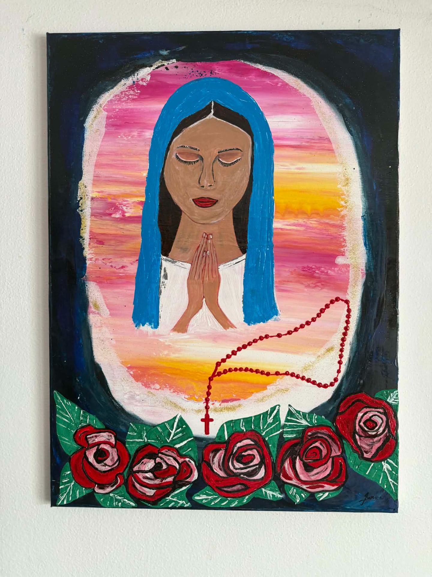 V spodnej časti obrazu sa nachádza rad červených ruží spolu s ružencom, ktorý symbolizuje vieru, oddanosť a nádej. Celková kompozícia pôsobí harmonicky a sústredene, akoby diváka vťahovala do chvíle meditácie a pokoja.