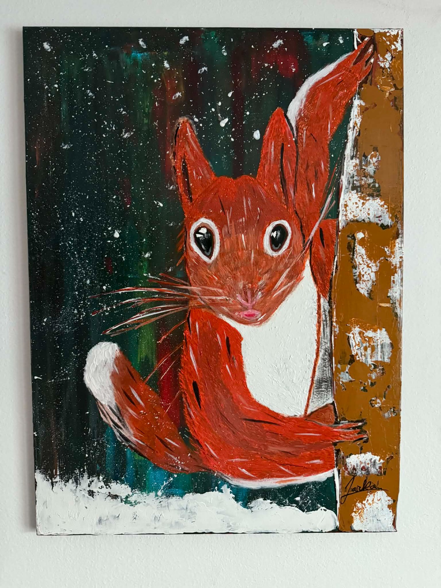 Akrylová maľba na plátne s rozmerom 75 × 55 cm zachytáva živý moment z prírody – veveričku, ktorá zvedavo vykúka spoza zasneženého kmeňa stromu. Autor pracuje s dynamickými ťahmi štetca, výraznou textúrou a kontrastnými farbami, ktoré dávajú srsti aj snehu plastickosť a energiu. Tmavé zimné pozadie zvýrazňuje teplý hnedo-červený tón zvieraťa, čím sa stáva dominantným prvkom obrazu. Padajúce vločky dotvárajú atmosféru pokojnej zimnej scény.