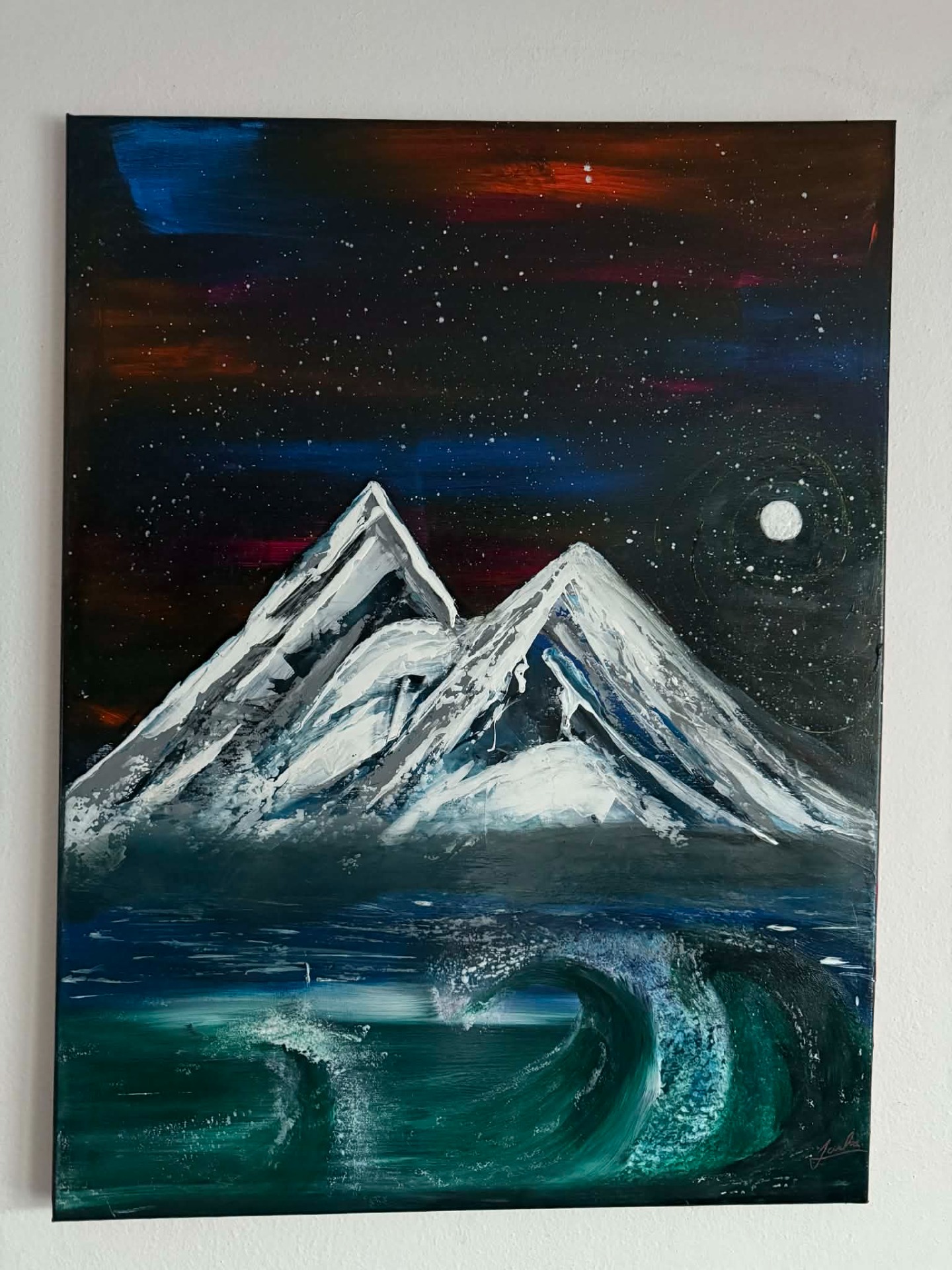 Akrylová maľba na plátne o rozmere 75 × 55 cm zachytáva dramatický stret prírody a abstrakcie. V popredí sa dvíhajú tmavé skaly so zlatými odleskami, ktoré pôsobia robustne a surovo. Na ne narážajú dynamické vlny tyrkysovo-bielej vody, vytvárajúce dojem neustáleho pohybu a sily.